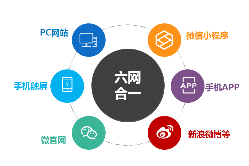 入口為六網(wǎng)合一(PC版、觸屏版WAP、微信版、微博信息推送、手機(jī)APP、一個(gè)主后臺(tái)),